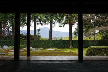 枯山水式の庭園は苔と石がちりばめられ、生垣の向こうには雄大な比叡山の光景が広がります。